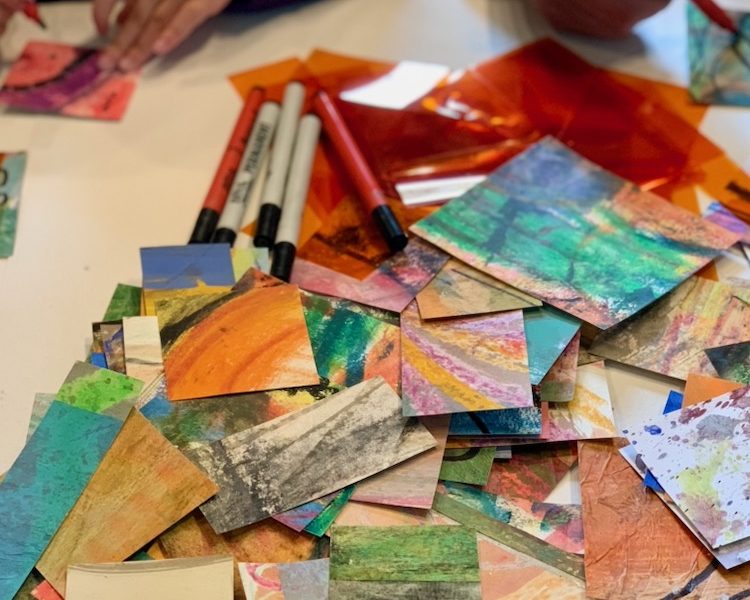 Guided with online demonstrations by Sophy, and with the freedom to explore in their own time at home, participants experimented with drawing, painting and collage techniques. Once a week, over Zoom, they shared ideas and artwork created between sessions and agreed on future weekly themes and activities.